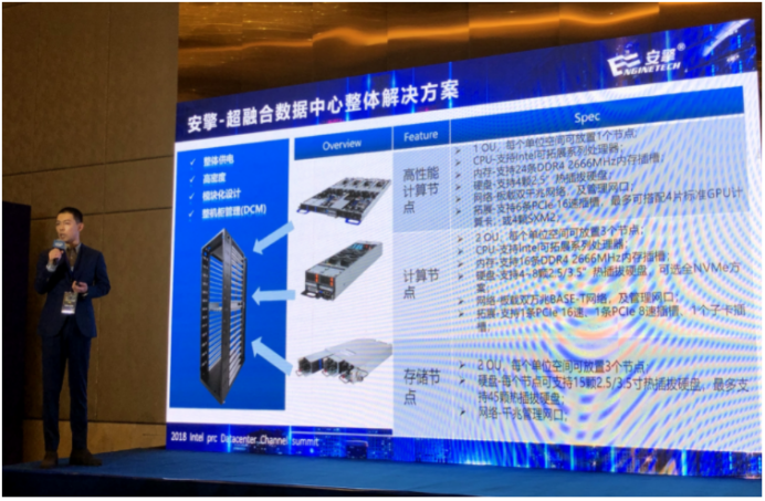 该产品广泛采用Intel最新的处理器、NVMe等先进技术,产品形态涵盖高性能计算、通用型计算、存储全系列规格,并且可以针对不同应用需求进行灵活地部署和弹性地拓展,在有限的单位空间内实现更高的密度,以达到最佳的应用效能,最大程度降低能耗与TCO。此外,今年会超融合数据中心整体解决方案通过与Intel DCM(数据中心管理平台)的优化组合,有效解决了数据中心在运维过程中最关键的监控、管理和节能问题。通过监控功能可提前侦测判断出潜在的危机,能够有效规避企业用户信息安全受到威胁;通过管理功能可以更好地维护和优化部署,保护IT设备高效稳定的运行,从而达到为企业用户节能的效果。